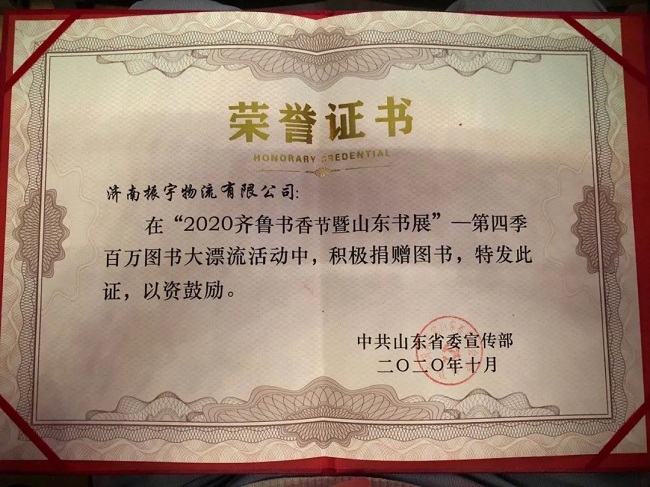 在頒獎環(huán)節(jié),因振宇物流傳遞溫暖與愛心的行為獲取高度評價,領(lǐng)取中共山東省委宣傳部頒發(fā)的榮譽(yù)證書。