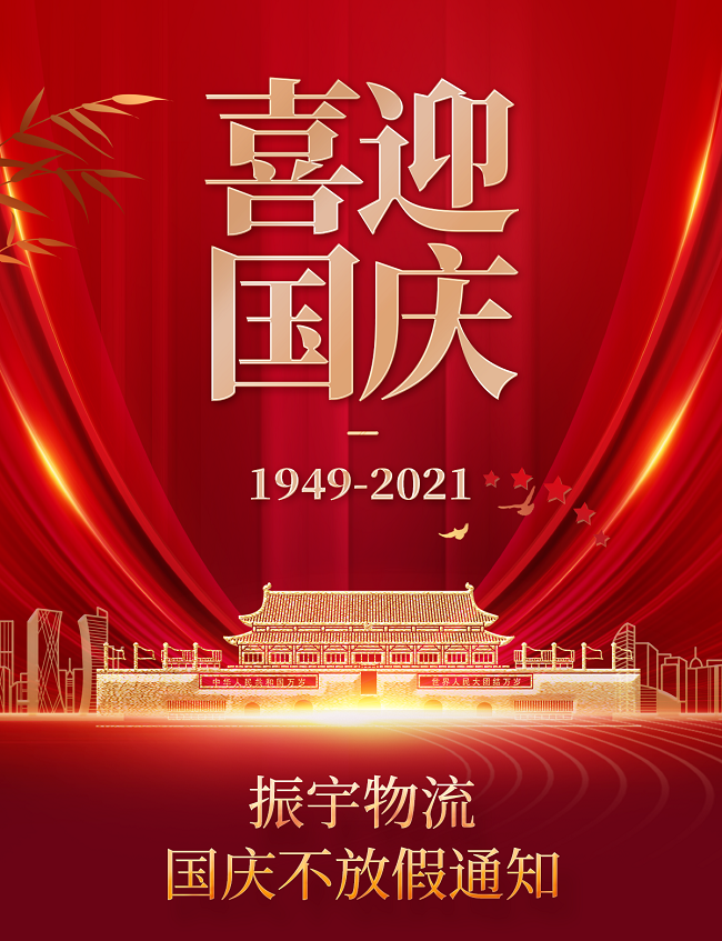 您好!正值秋高氣爽天,恰逢稻熟豐登日,祖國母親即將迎來72周年華誕。五星紅旗迎風(fēng)飄揚(yáng),我們同慶祖國華誕的榮光!振宇物流為了給您提供更好的服務(wù),并結(jié)合我司實(shí)際情況,現(xiàn)對國慶假日期間做出如下工作安排: