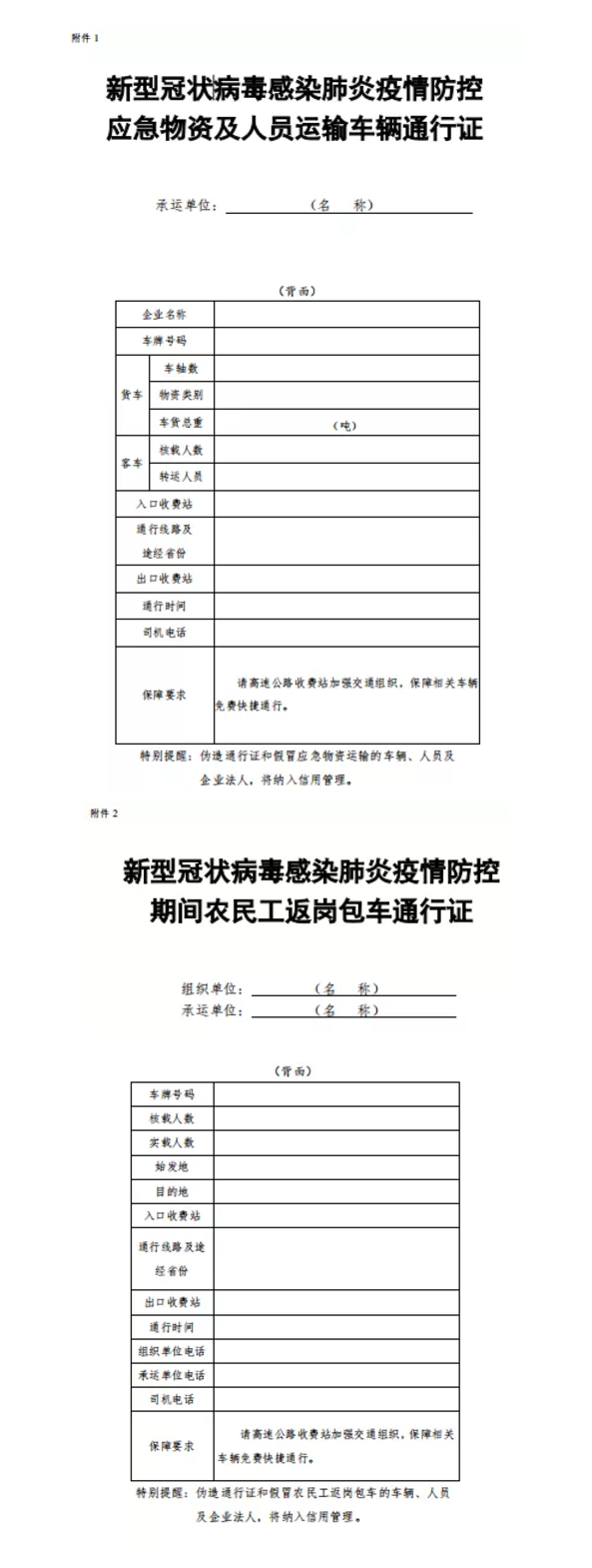 通知要求,地方各級交通運輸部門要認(rèn)真落實《交通運輸部關(guān)于切實保障疫情防控應(yīng)急物資運輸車輛順暢通行的緊急通知》和《交通運輸部關(guān)于疫情防控期間免收農(nóng)民工返崗包車公路通行費的通知》要求,切實簡化“新型冠狀病毒感染肺炎疫情防控應(yīng)急物資及人員運輸車輛通行證”(簡稱“車輛通行證”)、“新型冠狀病毒感染肺炎疫情防控期間農(nóng)民工返崗包車通行證”(簡稱“包車通行證”)辦理流程,通過政府網(wǎng)站、微信、電子郵件等便捷方式提供“車輛通行證”“包車通行證”統(tǒng)一式樣,供承運單位或駕駛?cè)嗽诒镜刈孕写蛴?、自行填寫?/span>