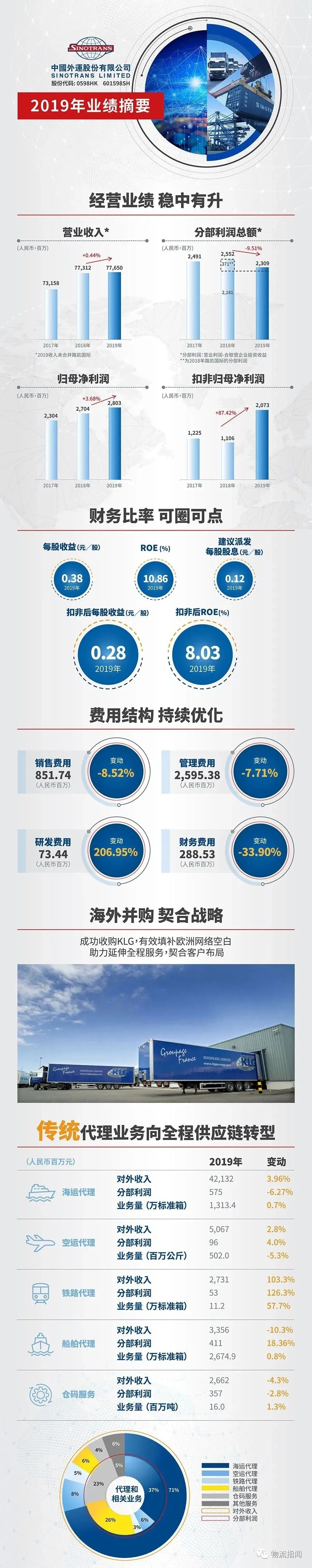 據悉,2019年,中國外運實現(xiàn)營業(yè)收入776.50億元,同比增長0.44%(可比口徑下實現(xiàn)增長2.4%);分部利潤實現(xiàn)23.09億,可比口徑下實現(xiàn)增長5.9%。實現(xiàn)歸母凈利潤28.03億元,同比增長3.68% ;實現(xiàn)扣非后的歸母凈利潤20.73億元,同比增長87.42%。每股收益為0.38元人民幣??鄯呛蟮腞OE增長了3.08個百分點。