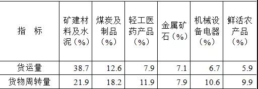 貨運(yùn)量的主要貨類(lèi)構(gòu)成中,“礦建材料及水泥”占比最高,為38.7%;其次是“煤炭及制品”,占比12.6%;“輕工醫(yī)藥產(chǎn)品”“金屬礦石”“機(jī)械設(shè)備電器”“鮮活農(nóng)產(chǎn)品”等貨類(lèi)次之,占比分別為7.9%、7.1%、6.7%和5.9%。