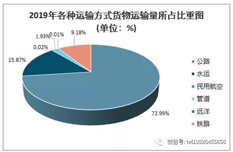 從貨物運輸?shù)姆绞嚼?,公路運輸仍然占據(jù)著我國貨物運輸行業(yè)的主導(dǎo)地位。2019年各種貨運運輸量中公路運輸量占比最大,達到了72.99%;其次為水運,占比為15.87%;鐵路運輸量占比9.18%,位居第三。我國民航運輸業(yè)起步較晚,仍處于發(fā)展階段,貨機數(shù)量整體來說相對較少,這導(dǎo)致2019年民航貨運量占比僅有0.02%。