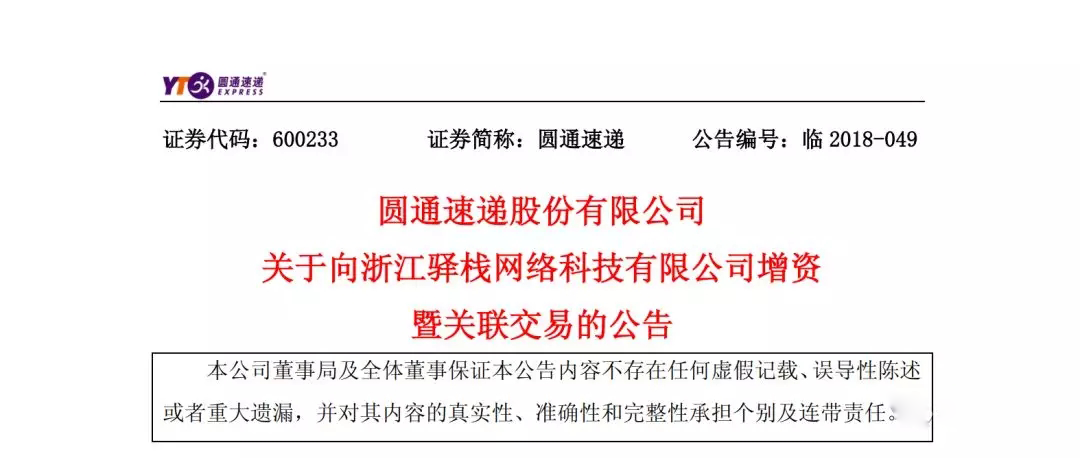 根據(jù)公告,圓通擬以自有資金4.5億元人民幣對浙江驛棧進行增資,其中1575萬元人民幣認繳新增注冊資本,4.3425億元人民幣計入資本公積金。本次投資后,公司將持有浙江驛棧1575萬元人民幣注冊資本,持股占增資完成后比例為6.28%。