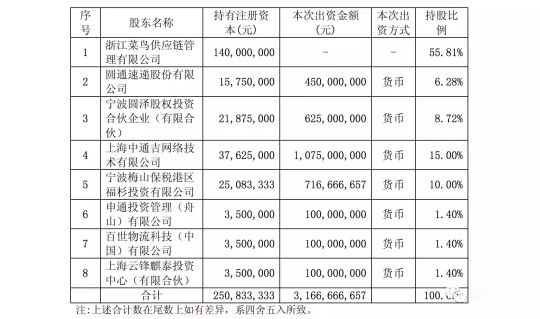 公告顯示,2018年第一季度,浙江驛??傎Y產6922萬元,總負債7257.9萬元,凈資產-335.9萬元,營業(yè)收入483.3萬元,凈利潤-1.14億元。本次增資前,浙江驛棧由浙江菜鳥供應鏈100%控股,本次增資后浙江驛棧的股本結構如下: