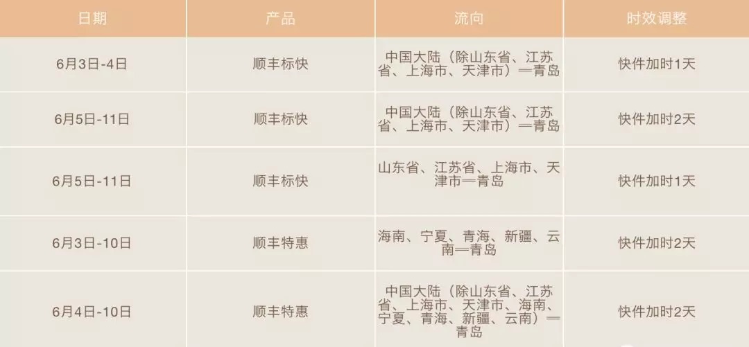 6月3日-11日,全網(wǎng)進(jìn)出青島流向的順豐次晨、即日、生鮮速配、部分醫(yī)藥冷運(yùn)等對(duì)溫度及時(shí)效要求較高的產(chǎn)品和冷藏冷凍件停收,物流普運(yùn)等重貨類(lèi)產(chǎn)品停收(重貨快運(yùn)加時(shí)不停收)。