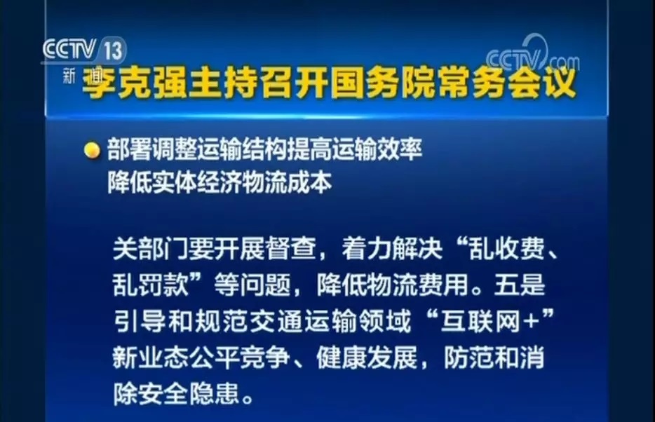 國(guó)務(wù)院總理李克強(qiáng)6月27日主持召開(kāi)國(guó)務(wù)院常務(wù)會(huì)議,聽(tīng)取深入推進(jìn)“互聯(lián)網(wǎng)+農(nóng)業(yè)”促進(jìn)農(nóng)村一二三產(chǎn)業(yè)融合發(fā)展情況匯報(bào);部署調(diào)整運(yùn)輸結(jié)構(gòu)提高運(yùn)輸效率,降低實(shí)體經(jīng)濟(jì)物流成本。會(huì)議指出,調(diào)整運(yùn)輸結(jié)構(gòu)、提高綜合運(yùn)輸效率,降低全社會(huì)物流成本,對(duì)提升實(shí)體經(jīng)濟(jì)競(jìng)爭(zhēng)力至關(guān)重要。